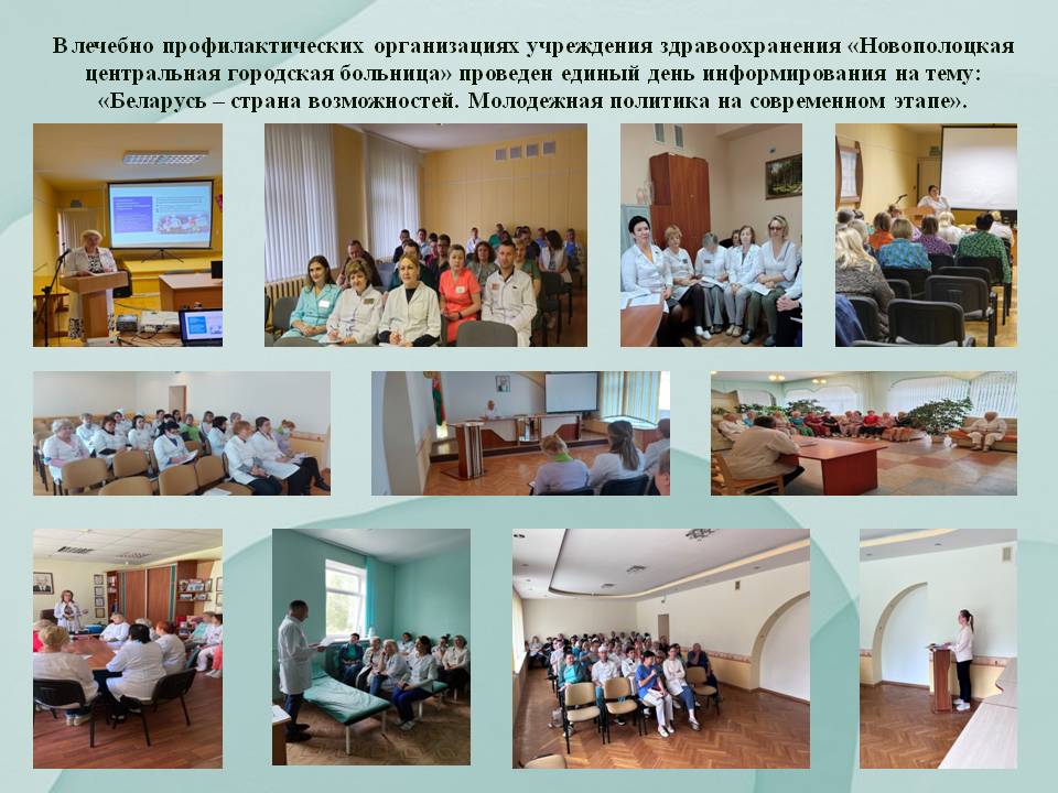 9.06.2025 года в лечебно профилактических организациях УЗ «Новополоцкая центральная городская больница» проведен единый день информирования, где рассматривался вопрос по теме «Беларусь – страна возможностей. Молодежная политика на современном этапе».