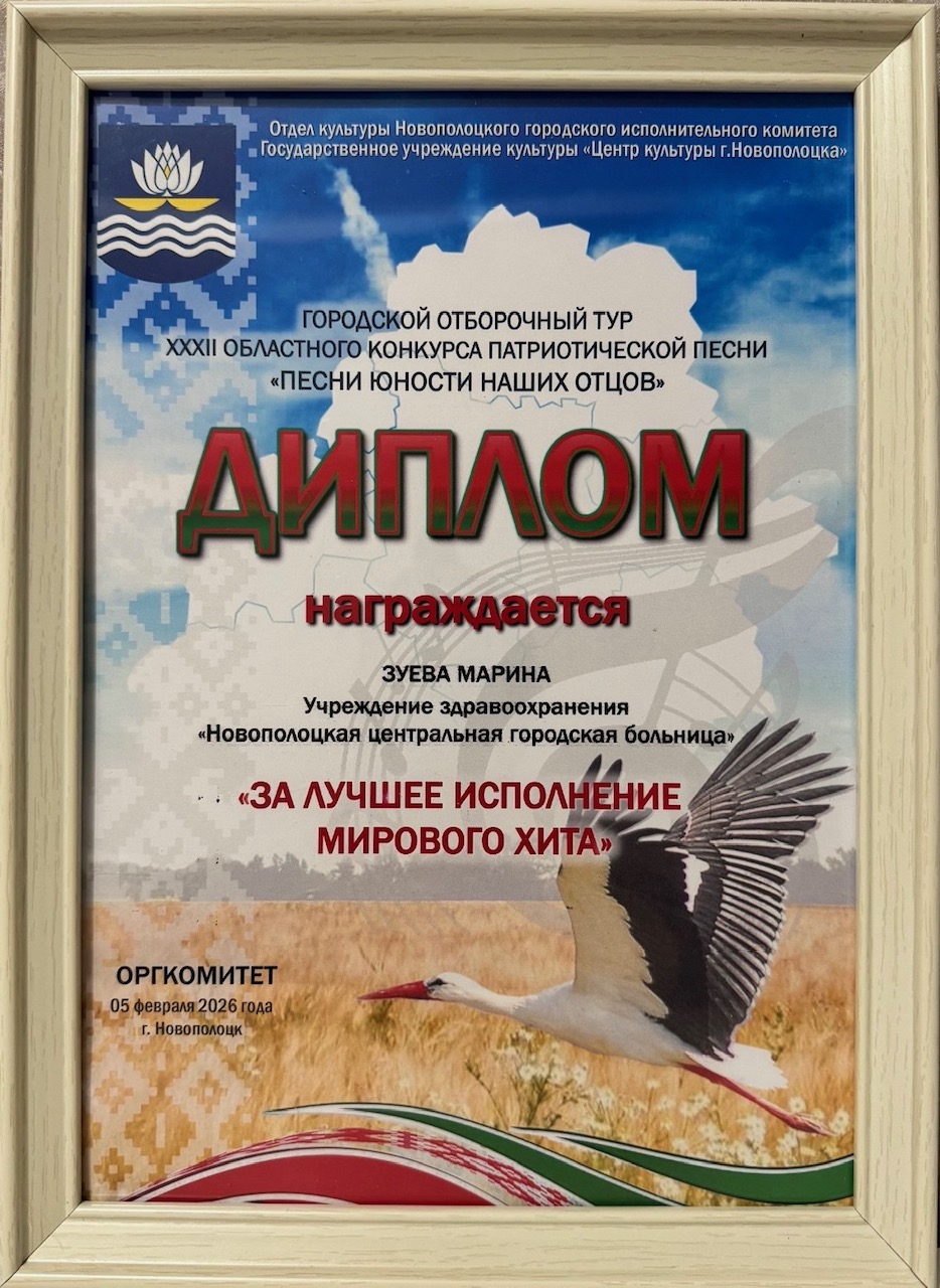 Конкурс «Песня юности наших отцов» является важным и значимым мероприятием, которое позволяет не только сохранить и передать культурное наследие, но и укрепить связь между поколениями. Марина Зуева помощник врача поликлиники № 1, представляя учреждение здравоохранения  «Новополоцкая центральная городская больница» , внесла свой вклад в это событие, демонстрируя важность культуры и искусства в жизни. Очень приятно, что медицинские работники не только заботятся о здоровье, но и активно участвуют в культурной жизни, поддерживая традиции через музыку и песни. В таких мероприятиях создаются условия для обмена опытом, укрепления командного духа и сплочения коллектива.