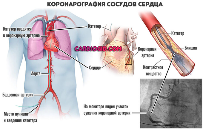 Иглой пунктируют бедренную артерию на ноге (в верхней трети бедра) или на руке (лучевую артерию на предплечье около запястья или плечевую артерию). По специальной методике в артерию вводят катетер называемый интродьюсером. Под рентгеновским контролем длинный катетер через интродьюсер по направляющей (проводнику) подводится к устью коронарной артерии, устанавливается непосредственно (селективно) в устье артерии. По катетеру селективно в коронарную артерию вводится рентгеноконтрастное вещество. Одновременно с этим, выполняется ряд рентгеновских снимков в разных проекциях (под разными углами), что позволяет увидеть внутренние контуры артерии с местами сужений (стенозов) и расширений, с местами закупорки артерий (окклюзий) и пристеночными тромбами; позволяет оценить состояние атеросклеротических бляшек (осложнённые, разорванные, расслоенные и т.п.).
